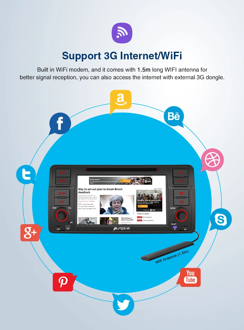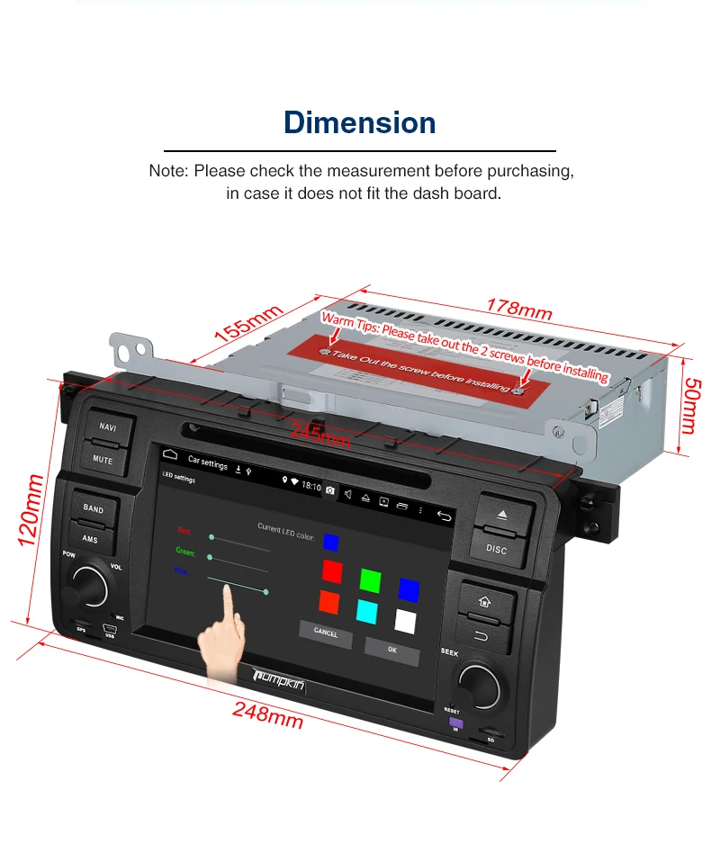 Pumpkin 2 Din 7''Android 9.0 Car DVD Player For BMW E46/M3 GPS Navigation Car Stereo FM Rds Radio Bluetooth Wifi 4G Headunit Applicable Models:The following car model and year are for reference, please make sure your original car radio has the same shape as our unit.sBMW 3 Series:1998 to 2001 -E46(BMW Old 17-Pin connector)BMW 3 Series:2002 to 2006 -E46(BMW new 40-Pin connector)BMW M3(1998-2006)BMW 318/320/325/330/335(1998-2006)(Notice:This unit does not support the original car's convers+ function.)Specifications:OS: Android 9.0 PieCPU: 8-Core 64-bit CPU Coretex-A53 RAM: 4GBROM: 32GBRadio IC: NXP6686Bluetooth: BT 4.0Working Voltage: 10.8~14.8V DCAudio output: 4*50W MaxBoot time(2nd time): about 1sScreen:Screen Size: 7-Inch Digital ScreenResolution: 1024*600Capacitive Touch Screen (5 points)Image Brightness /Contrast/ Color AdjustableOperation SystemThis unit is powered by Android9.0 system, 8-Core 64-bit CPU Coretex-A53 which will provide you a different experience than before.EQBuilt-in TDA7851L amplifier IC,Supports subwoofer audio output, and control it separately.Max audio output: 4 X 50W,Multi-color button lightPanel buttons light RGB color are available, you can change it freely to match your vehicle.Phone MirroringMirror your phone on the 7 inch screen.For Android phone ,you can mirror and control on the unit via USB cable connection ,Air Play For iPhone, you can just mirror on the unit via wifi connection ,can not controlGPS:Support online and off-line navi app, support 3D Maps and voice guidance, your long journey will no longer be bothered by the nightmare of getting lost.Map Storage Mode: Micro SD CardVoice Guidance: Yes3D Map: Yes(Support radio/Bluetooth/USB/SD playback while navigating.)DAB+ Digital Radio (Extra DAB+ box NA7001B required)Digital Audio Broadcasting allows you multi-regional music with your local well-known and also new channels. CD sound quality and noise-free in excellent transmission make DAB Radio a special experience in the vehicle.which make DAB broadly accessible to most of Europe.AV OutputFor this unit, it can output the DVD or AUX video to the headrest.Bluetooth 4.0:Built-In Microphone in the control panel for hands free calling functionExternal microphone also included for free clear voice callingSupport Bluetooth audio player/Phone Book function, quick search contacts.(Attention: This function can only be realized when the mobile phone supports Bluetooth Audio Output/Contacts Output)Support Bluetooth Connection for iPhone/ Most Android Phones/ Even some None Smart Phone(Attention: The Bluetooth just for audio stream transfer, it doesn’t support file transfer or Internet tethering.)Steering Wheel ControlChange the track, volume, etc. conveniently without taking your hands off the steering wheel, which makes your driving much safer.RadioHigh quality radio IC: NXP6686, with good radio reception.AM/FM tuner built in (worldwide)AM frequency range: 522-1620 (Europe), 530-1710 (America), 522-1620 (Russia)FM frequency range: 87.5-108 (Europe), 87.5-107.9 (America), 65.0-109.0 (Russia)RDS Radio: YesUSB/SD:Built in micro SD card slot/ USB Port.Support SD card/ USB drive up to 128GB.Support Audio Formats: MP3/WMA/WAV/APE/FLAC/OGG/AC3, etc.Support Video Formats: RMVB/AVI/MPG/MPEG/VOB/MOV/ASF/FLV/3GP/MP4, etc.OSD Language:English, German, French, Russian, Spanish, Turkish, Portuguese, Arabic, Chinese, Italian, Thai, Hebrew, Danish,Hungarian,Dutch,Polish,Finnish,Greek,Bulgarian,Belgian,Swedish,Japanese,etc.OBD2 (Extra device required)Compatible: Most of Bluetooth type ELM327 OBD2 scanner and wifi OBD2 (Search Y0004/Y0034 on our store)Compatible Application: TorqueDisplay Data: Real-time data and trouble codes from vehicles computer.(Attention: Few cars may not support the ECU reading accessing, those cars will not work this function.)WIFI/4G internet4G internet (Extra device required)Support 4G internet, Require external USB 4G modem. WIFI: Built in WIFI modemDirect turn on WIFI function to search and connect to any free WIFI hotspots(It comes with 1.5m long WIFI antenna for better signal reception.)Cam-In(Extra device required)Support RCA type reverse camera input, automatically trigger to reverse camera when reversing the car. DVDSupport all formatsDVD drive: Region FreeCompatible Formats: AVI/DVD/DVD+R/DVD-R/DVD+RW/DVD-RW/VCD/MP3/CD/CD-RW/JPEG etc.